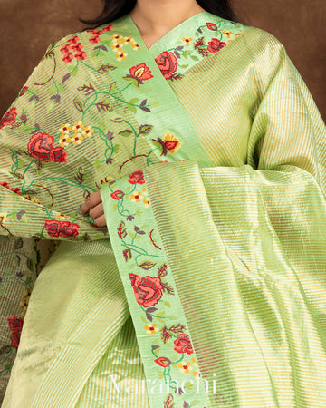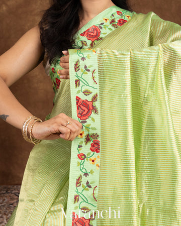 Pista Green Cross-Stitch Tissue Striped Pure Katan Silk Saree