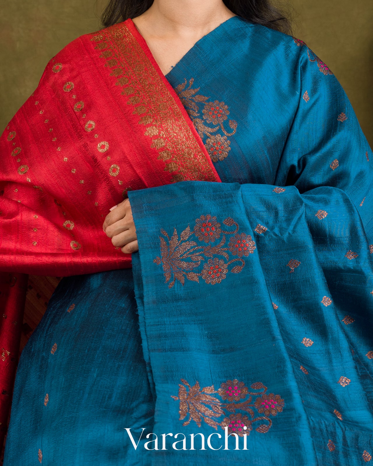 Prussian Blue Borderless Pure Raw Silk Handloom Saree