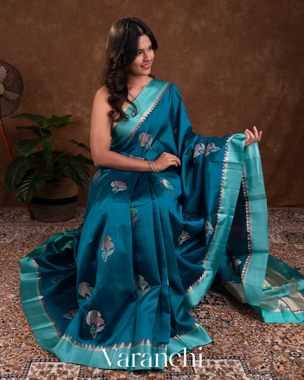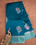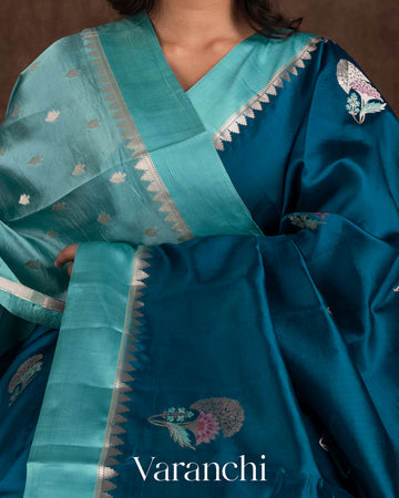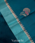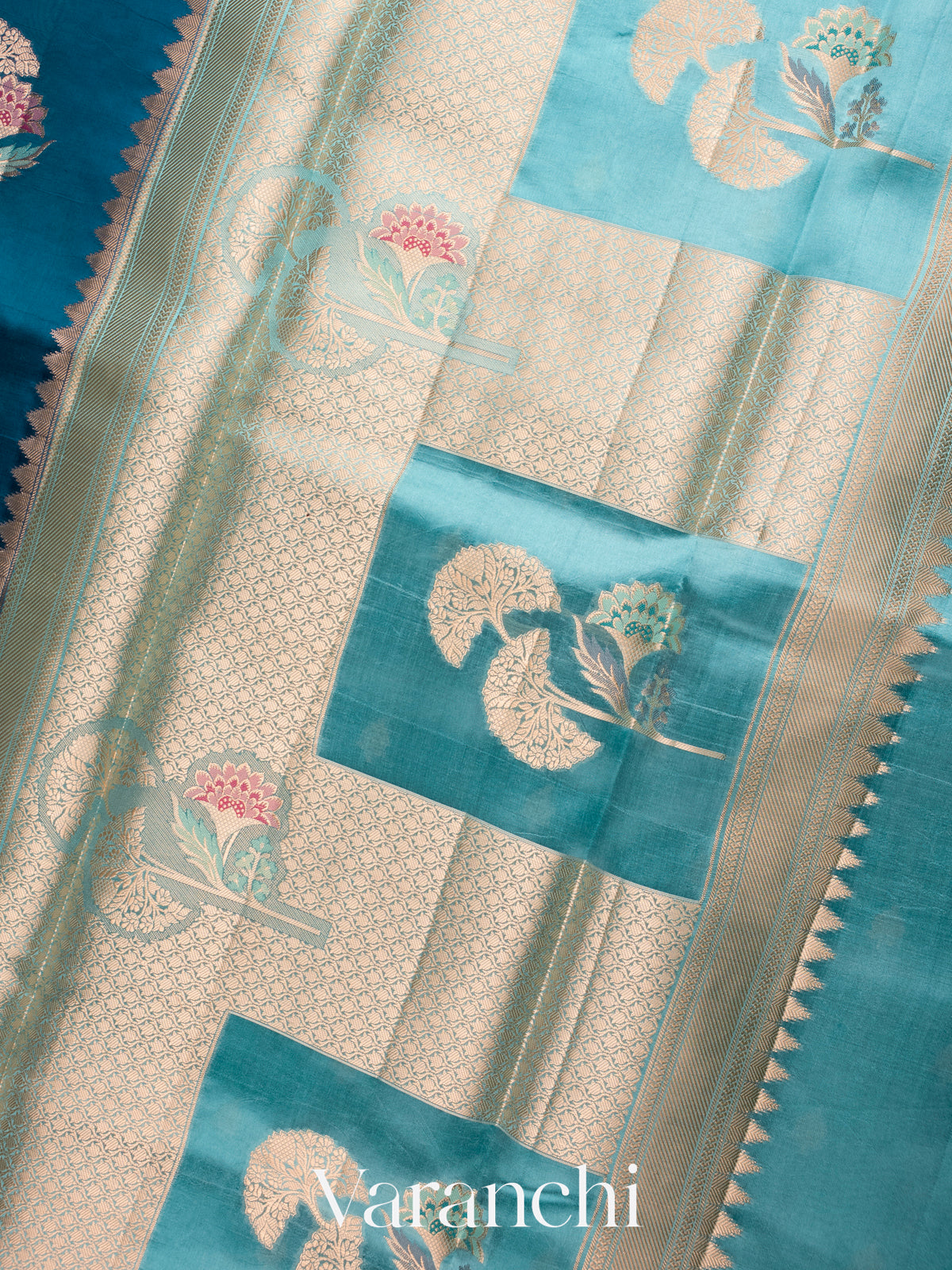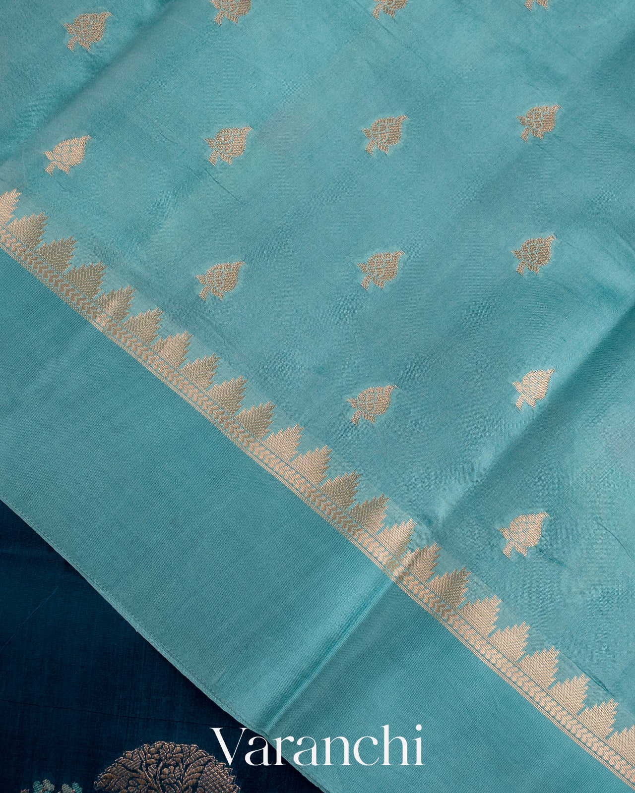 Blouse Piece Included in Pastel Blue Colour with Light Gold Zari Jaal Pattern (1 mt. approx) |