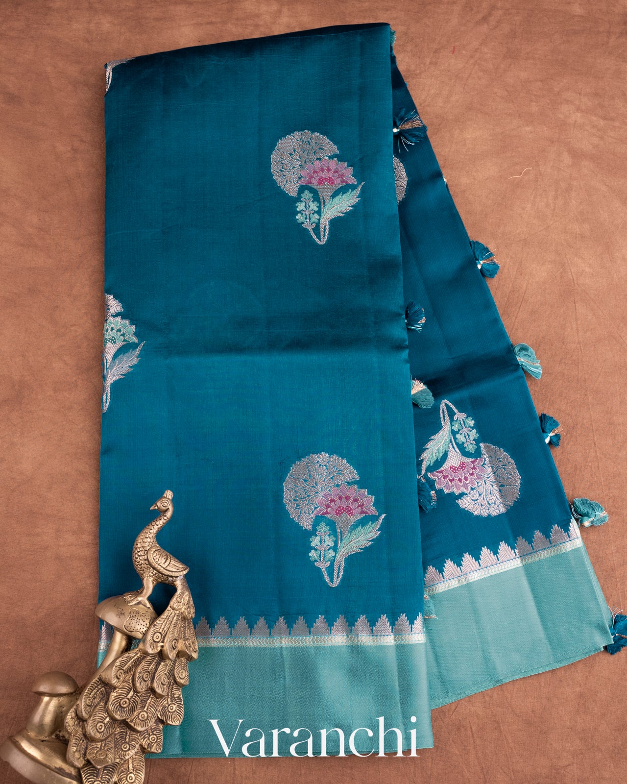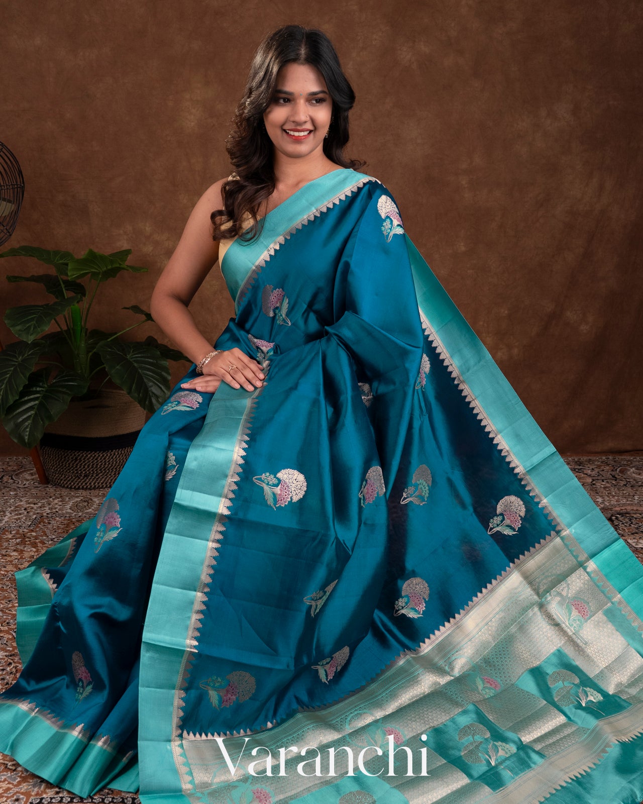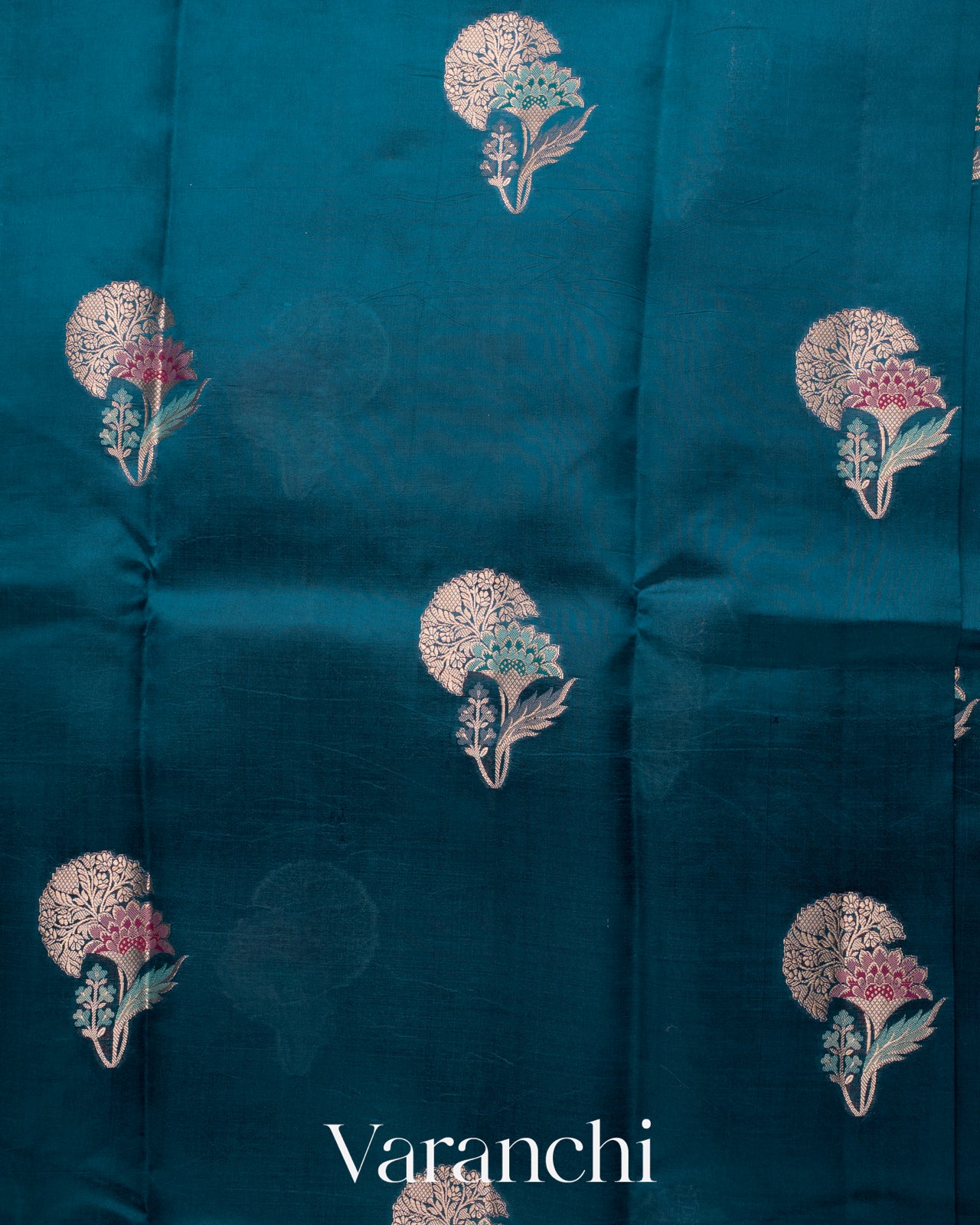 Blouse Piece Included in Pastel Blue Colour with Light Gold Zari Jaal Pattern (1 mt. approx) |
