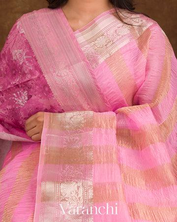 Rose Pink Tissue Striped Pure Kora Silk Saree