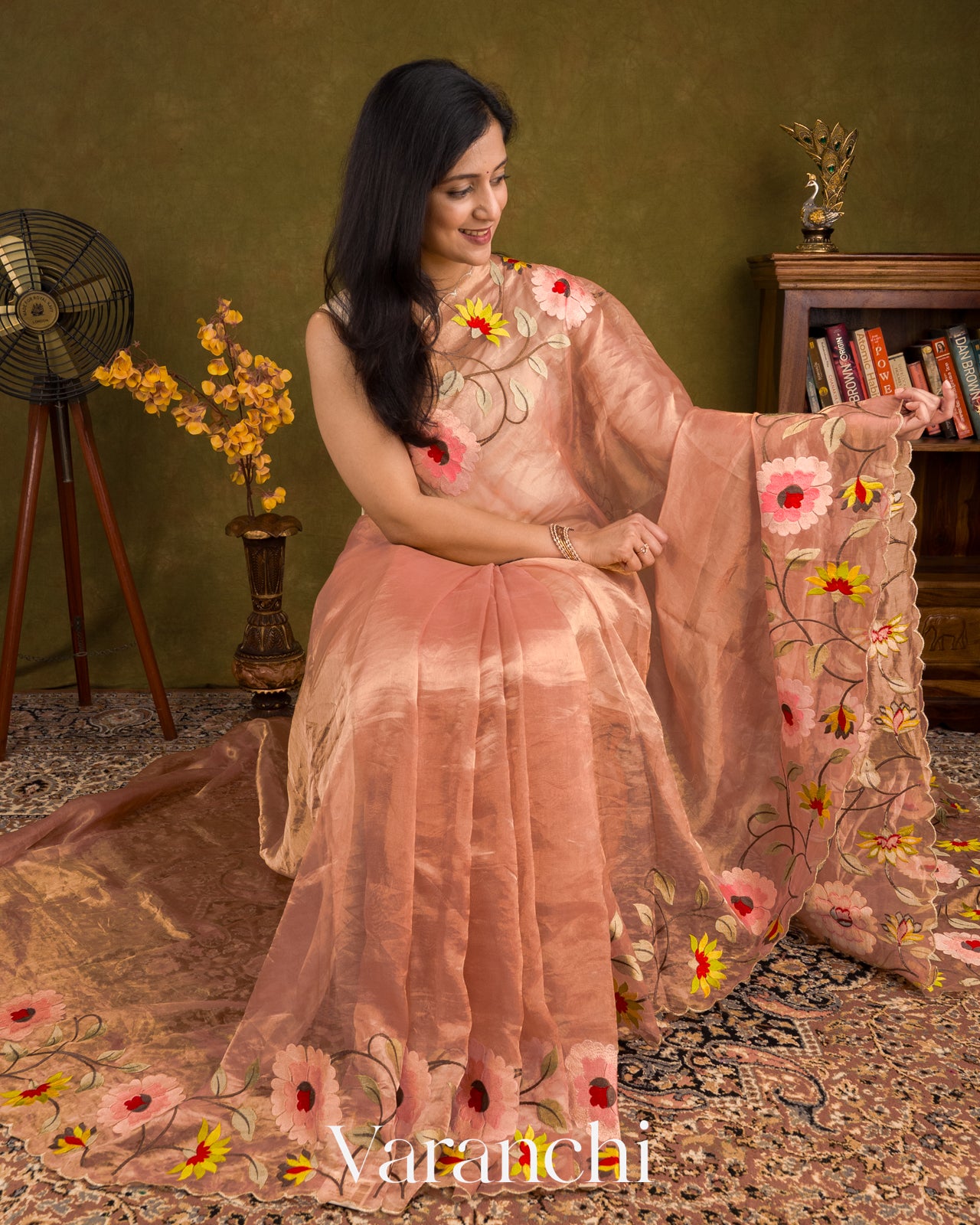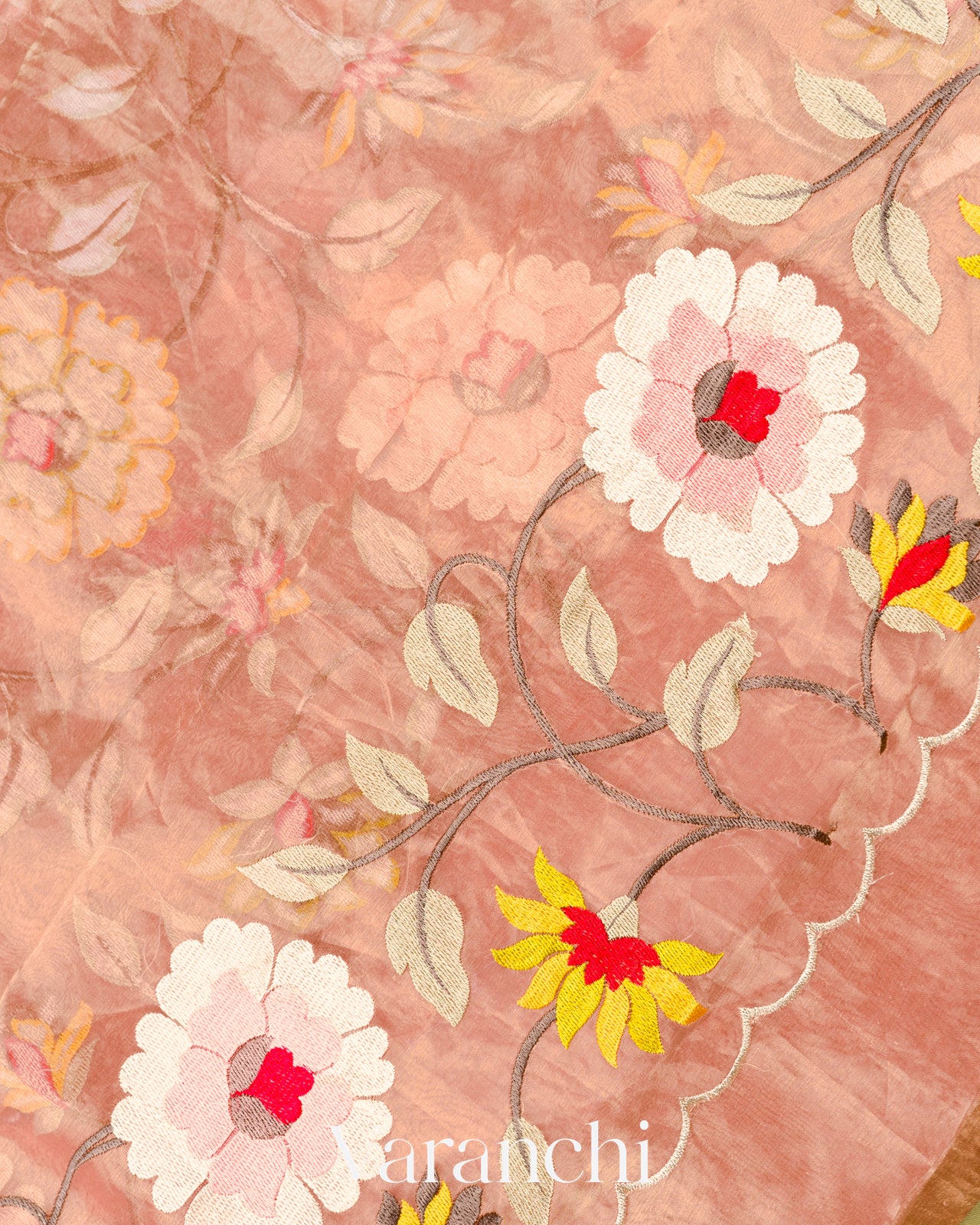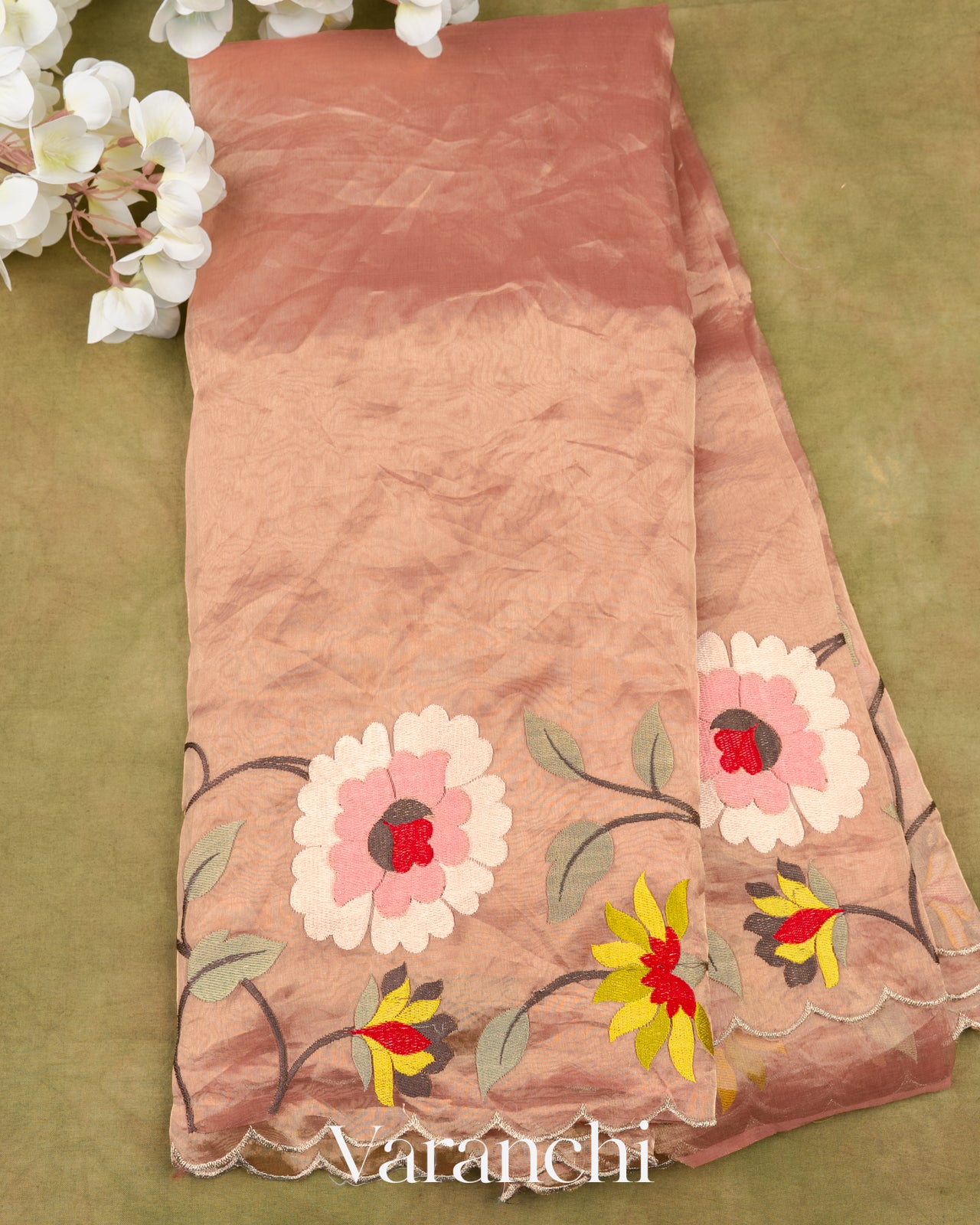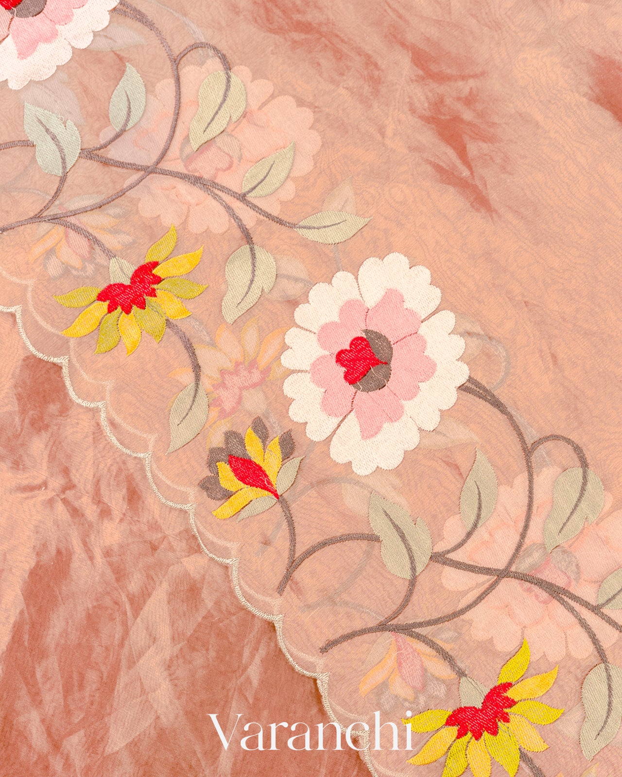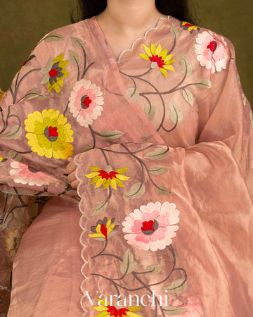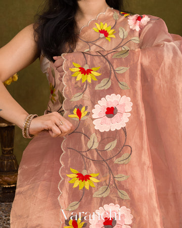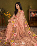 Light Peach Floral Embroidered Pure Tissue Kora Silk Saree