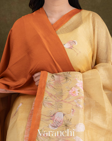 Sandal Yellow Floral Printed Pure Silk Linen Saree