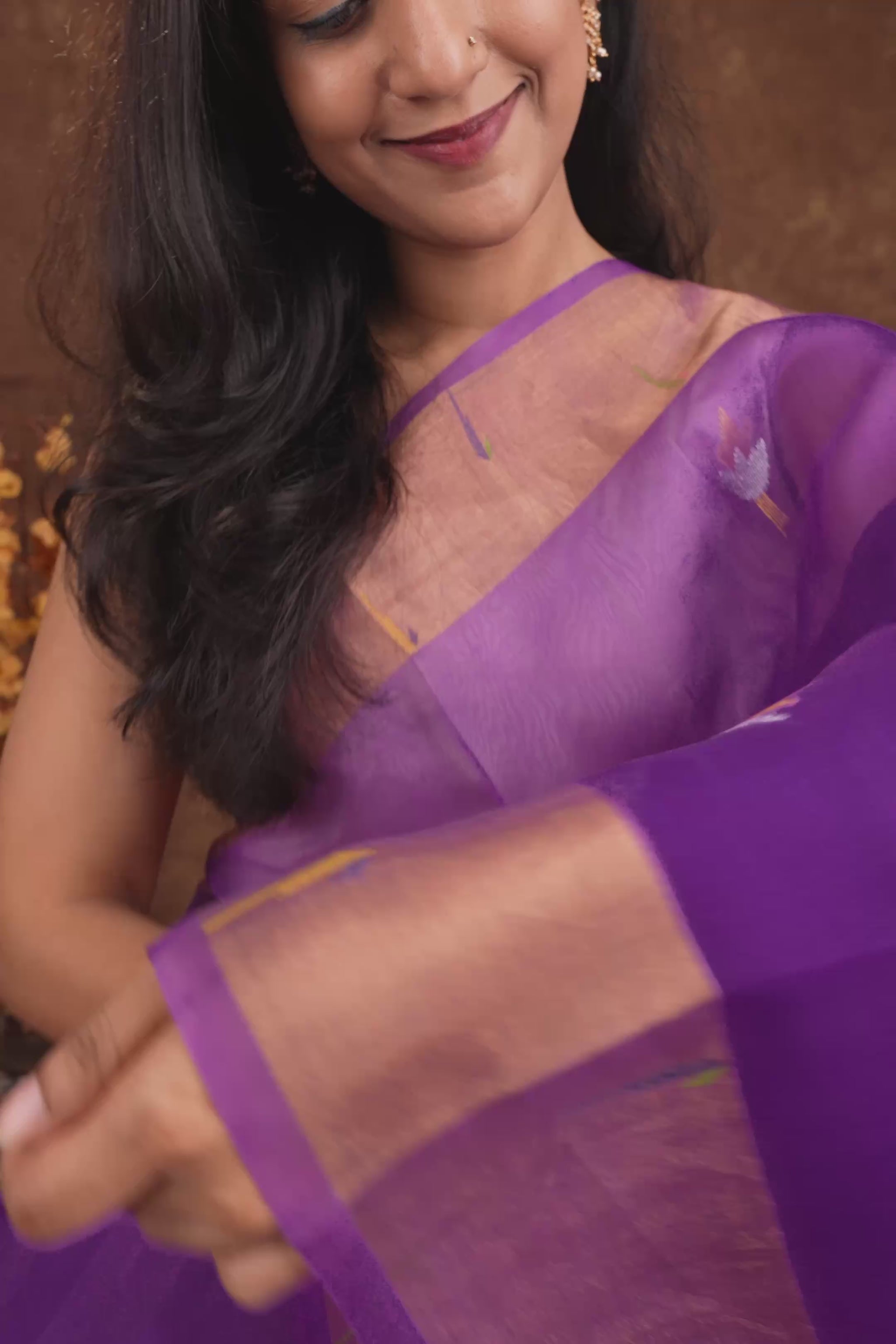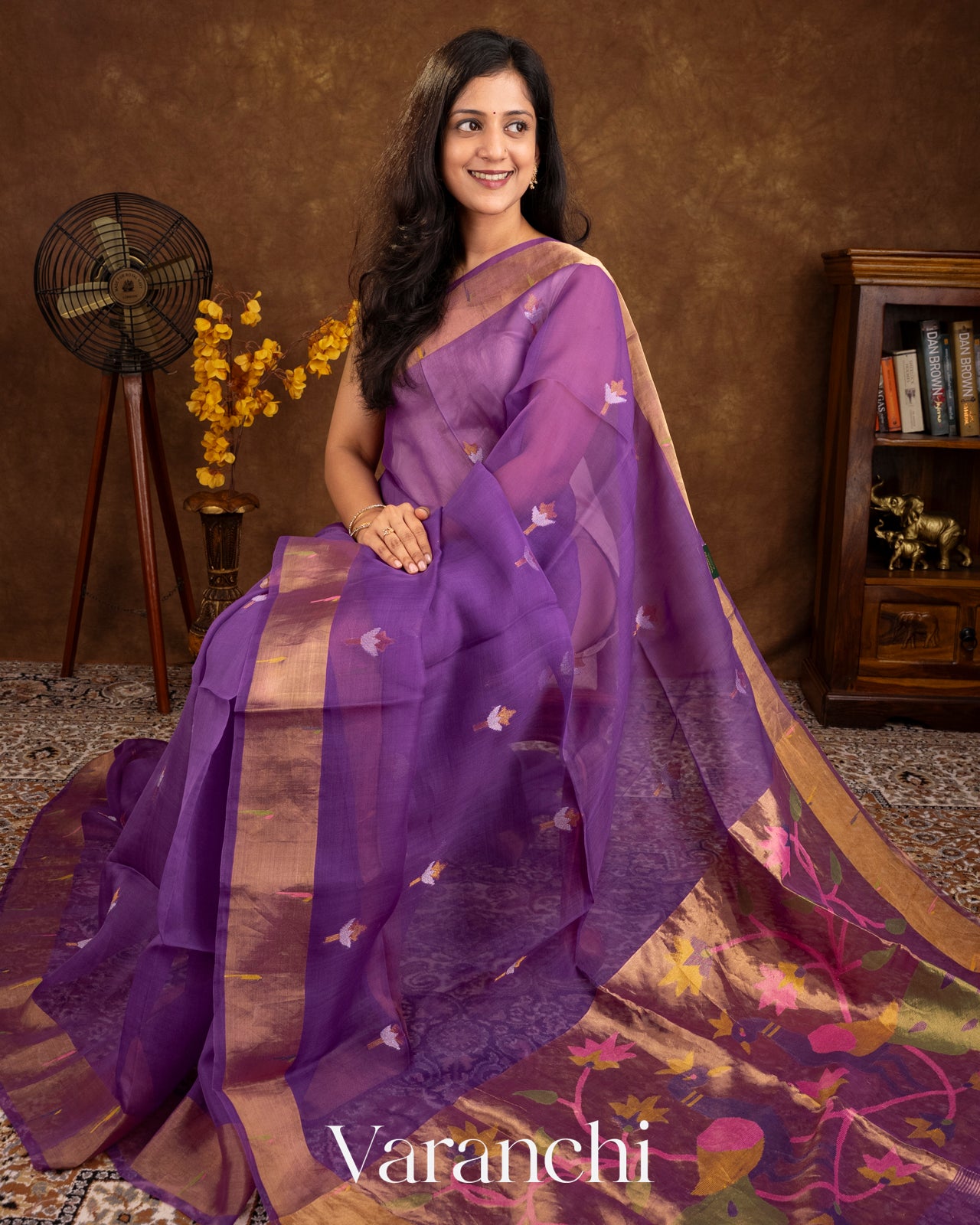 Violet Pure Muslin Jamdani Silk Paithani Pallu Handloom Saree