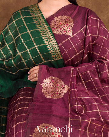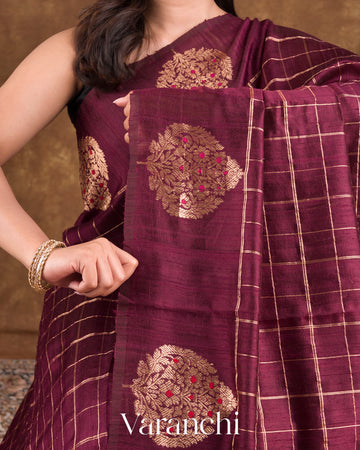 Wine Purple Checks Pure Raw Silk Handloom Saree