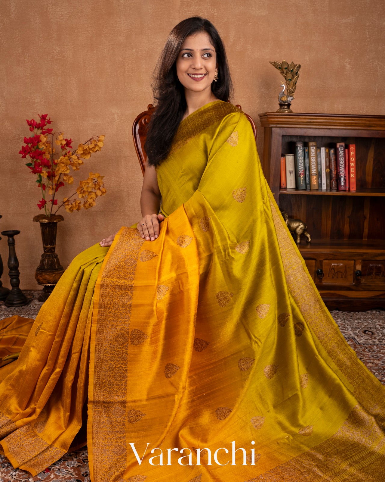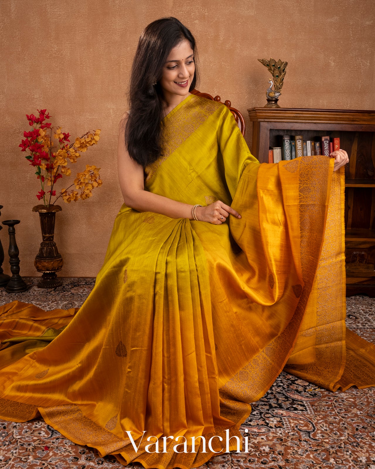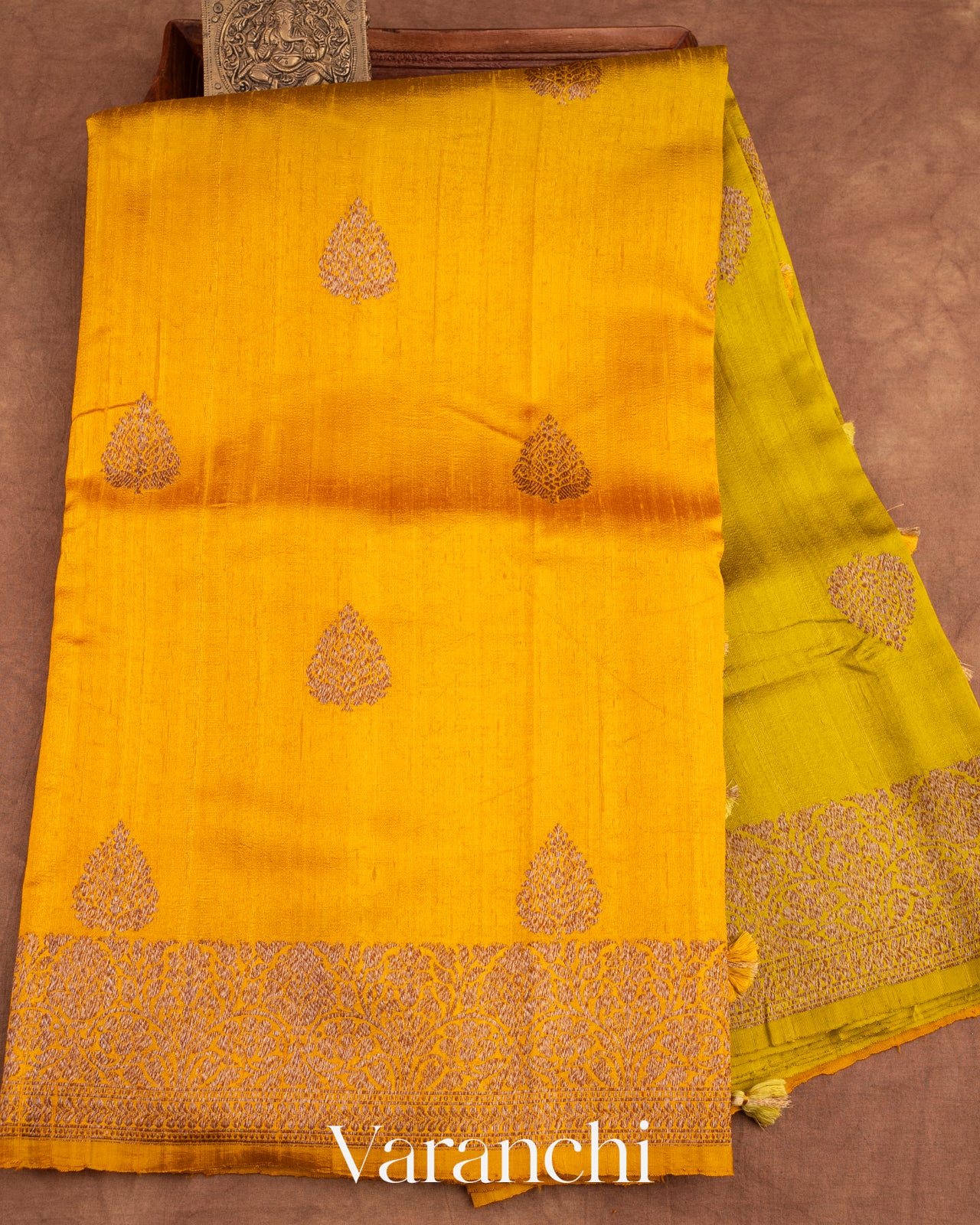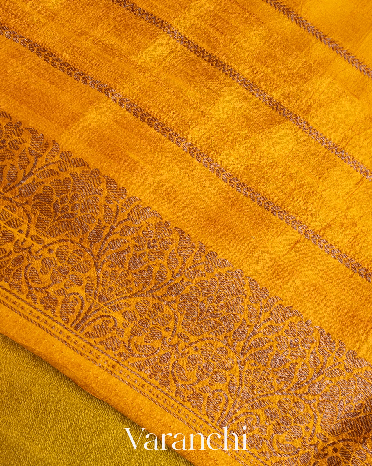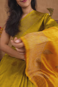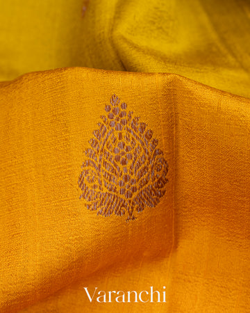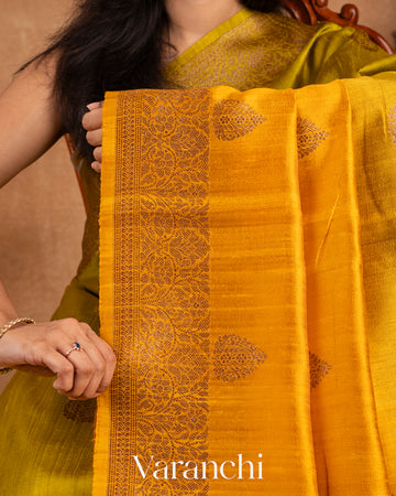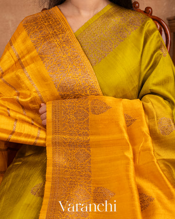 Bright Turmeric Yellow and Lime Green Ombre-Dyed Raw Silk Handloom Saree